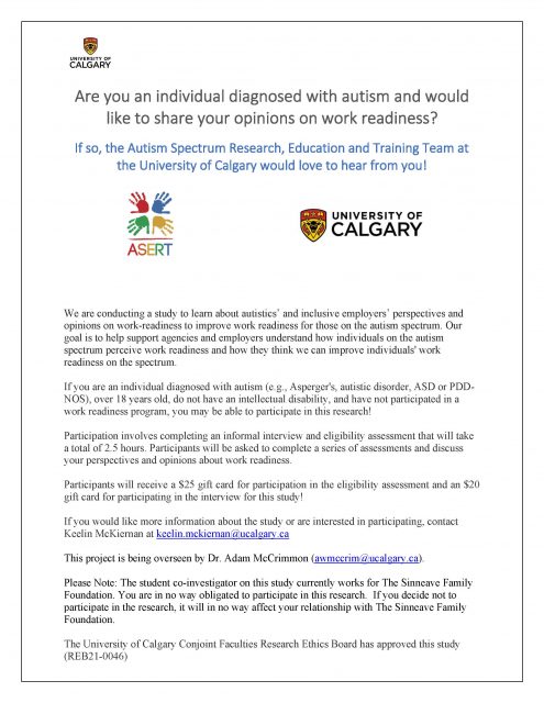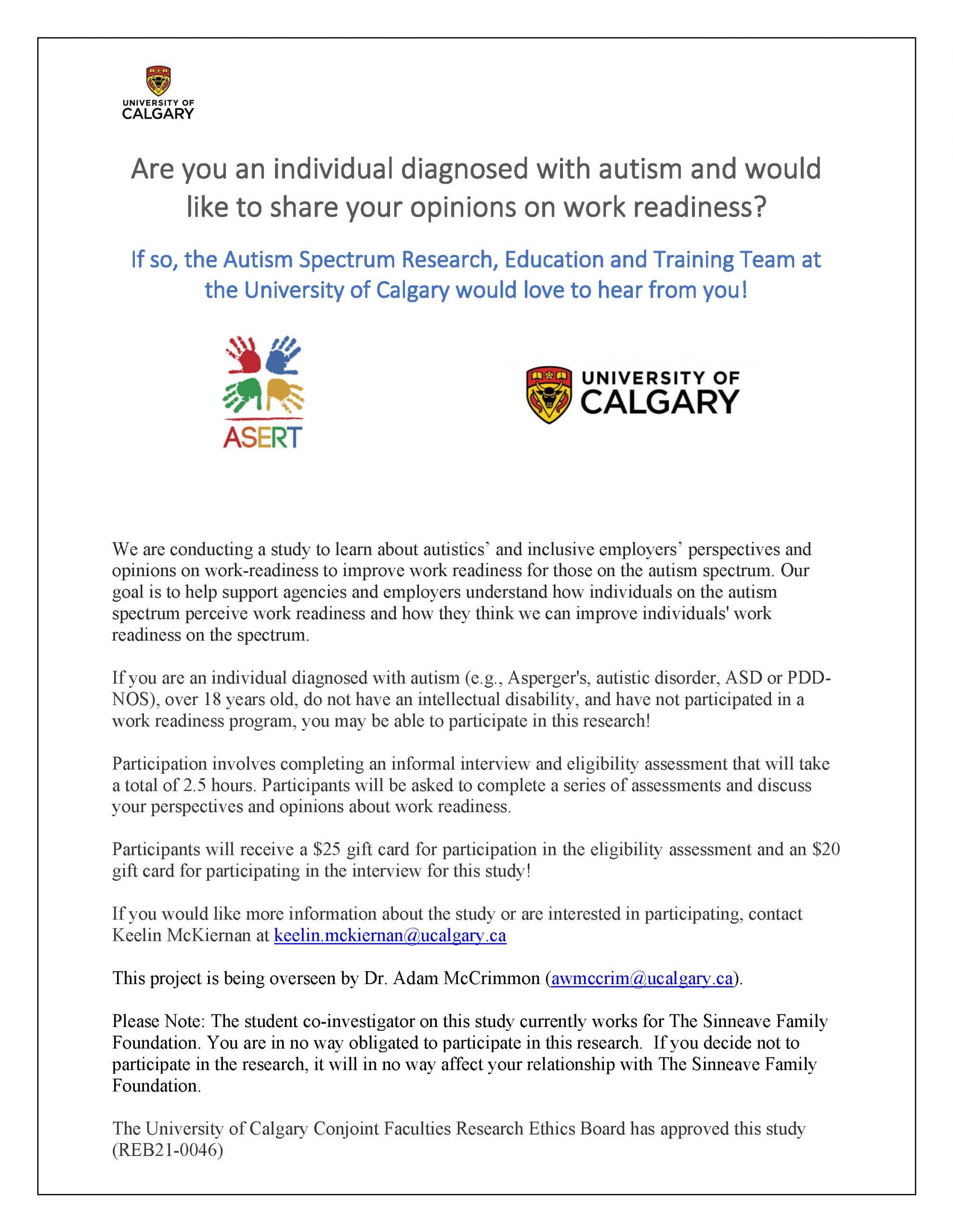 The Autism Spectrum Research, Education and Training Team at the University of Calgary is conducting a study to learn about autistics’ and inclusive employers’ perspectives and opinions on work-readiness to improve work readiness for those on the autism spectrum. Our goal is to help support agencies and employers understand how individuals on the autism spectrum perceive work readiness and how they think we can improve individuals’ work readiness on the spectrum.