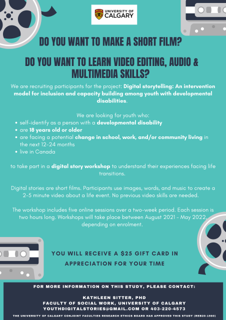 Dr. Kathleen Sitter (Faculty of Social Work, University of Calgary) is recruiting participants to take part in a digital story workshop to understand their experiences facing life transitions. The project is called Digital storytelling: An Intervention model for inclusion and capacity building among youth with Developmental disabilities.